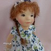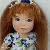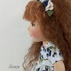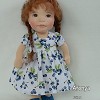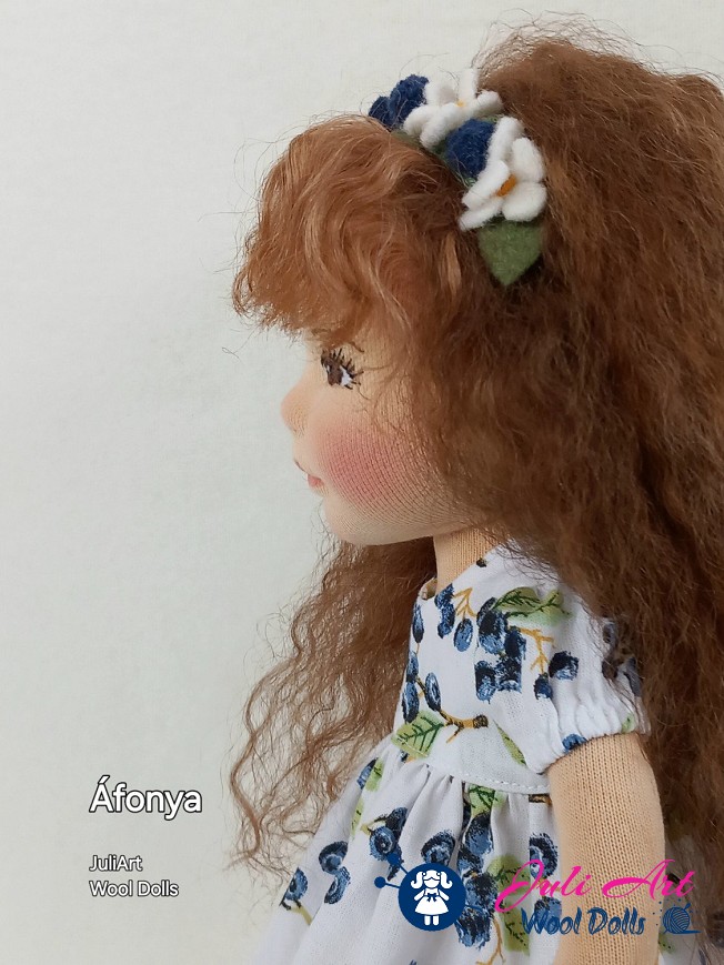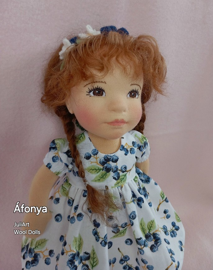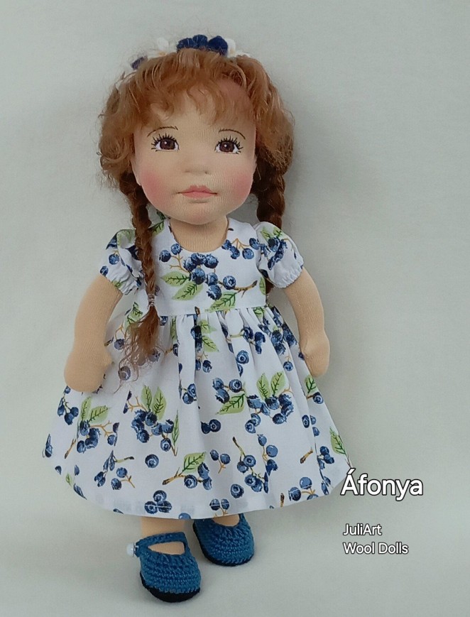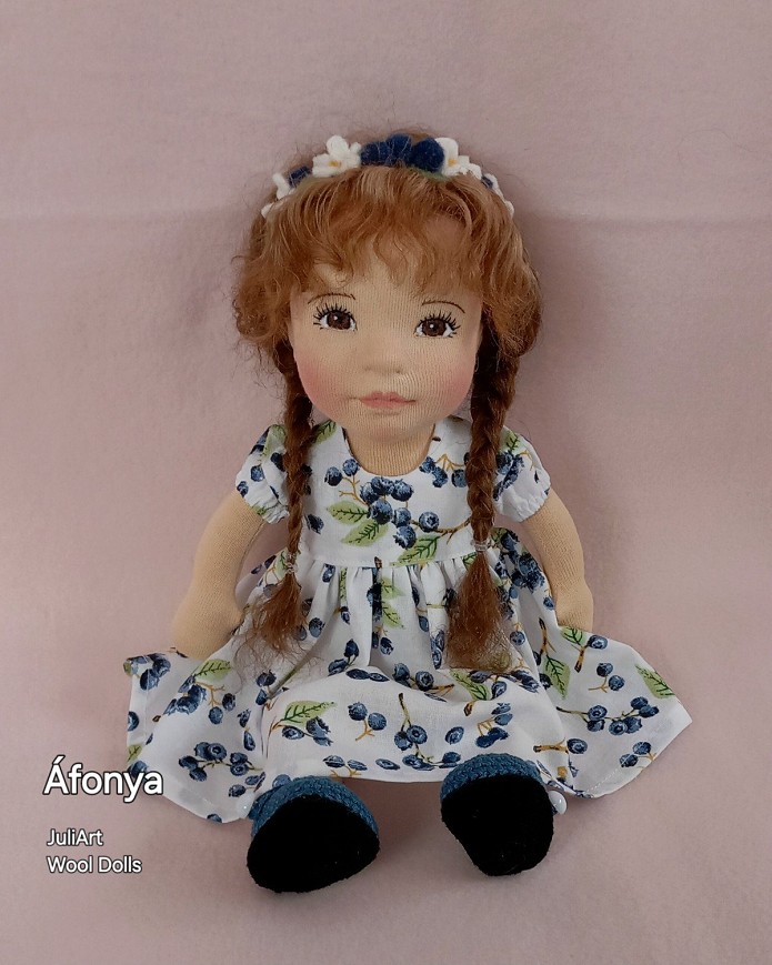 Áfonya öltöztethető, fésülhető baba. Arcát-testét tűnemezeléssel formáztam, sötétbarna szemeit kézzel hímeztem. Haja gyapjútincsekből készült, frizurázható, ritka fogú fésűvel fésülhető. Pamutvászon ruhácskával, horgolt pántos cipőcskével, gyapjúfilcből készült hajpánttal érkezik. Plusz ruhát is kérhetsz hozzá a rendeléssel egyidőben vagy a későbbiekben bármikor.