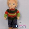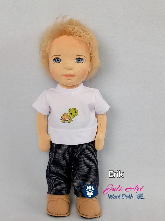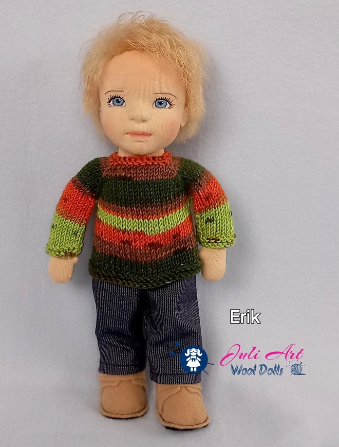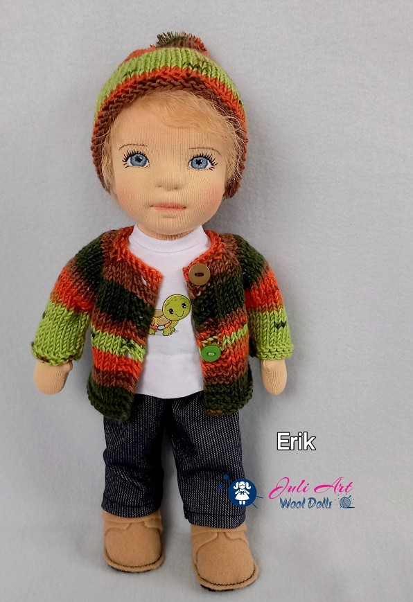 Erik öltöztethető, fésülhető baba. Arcát-testét tűnemezeléssel formáztam, kék szemeit kézzel hímeztem. Haja mohair fonalból készült. Kis pamut pólóval, farmer nadrággal, kötött kardigánnal és sapkával, tépőzáras gyapjúfilc cipővel érkezik. Plusz ruhát is kérhetsz hozzá a rendeléssel egyidőben vagy a későbbiekben bármikor.
