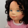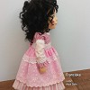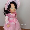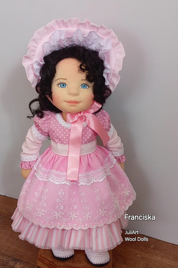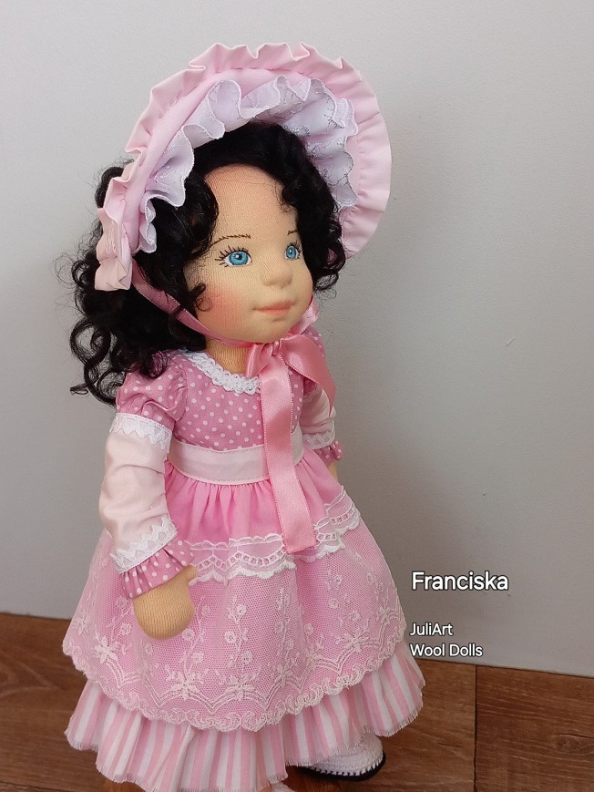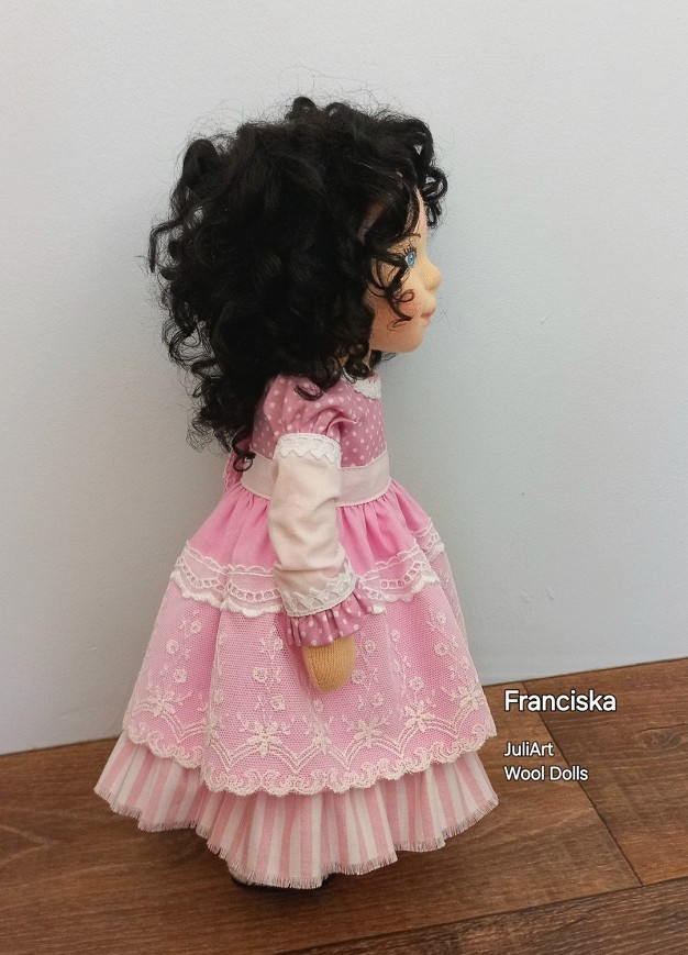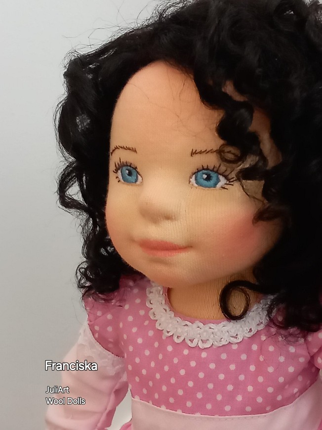 Franciska öltöztethető, fésülhető baba. Arcát-testét tűnemezeléssel formáztam, kék szemeit kézzel hímeztem. Haja eredeti fekete gyapjútincsekből készült, frizurázható, ritka fogú fésűvel fésülhető. Egyedi csupa fodor-csipke pamutvászon ruhácskával, főkötővel, horgolt pántos cipőcskével érkezik. Plusz ruhát is kérhetsz hozzá a rendeléssel egyidőben vagy a későbbiekben bármikor.