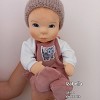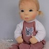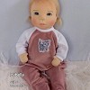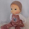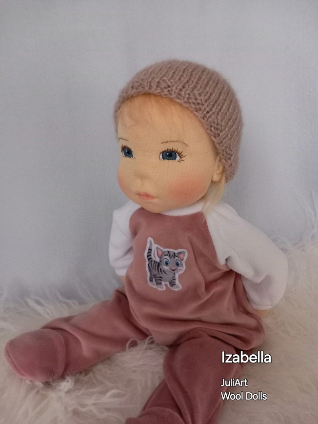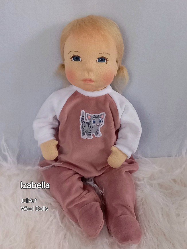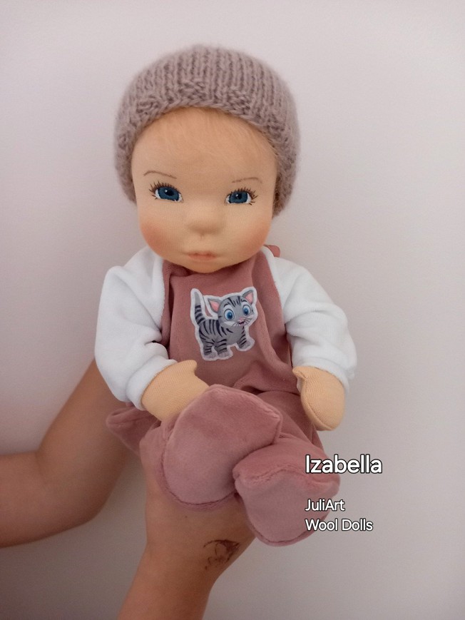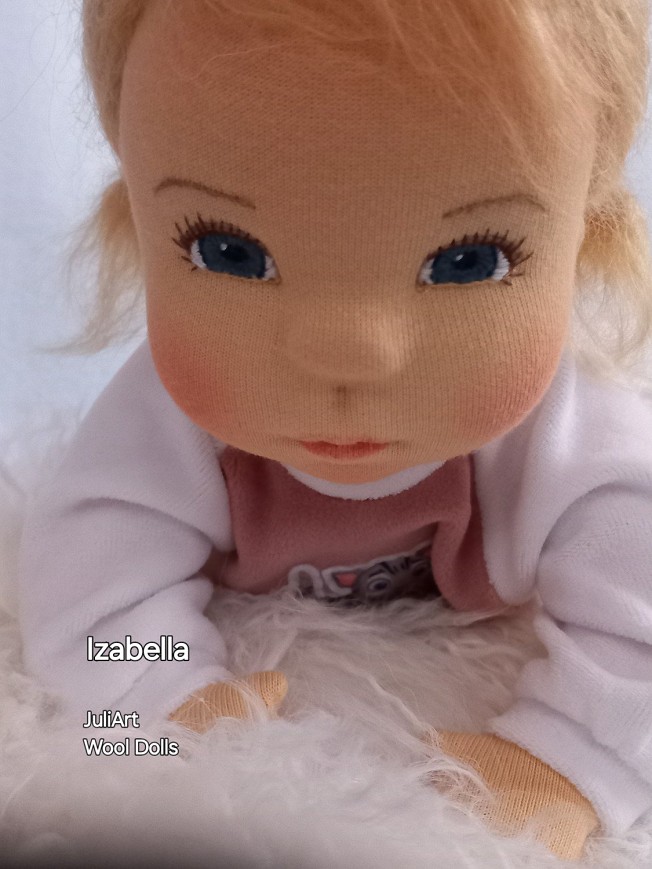 Izabella öltöztethető pelenkás baba, karja-lába enyhén hajlított. Arcát-testét tűnemezeléssel formáztam, sötétkék szemeit kézzel hímeztem, haja mohair fonalból készült, ritka fogú fésűvel fésülhető. Plusz ruhát is kérhetsz hozzá a rendeléssel egyidőben vagy a későbbiekben bármikor.