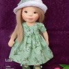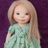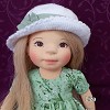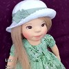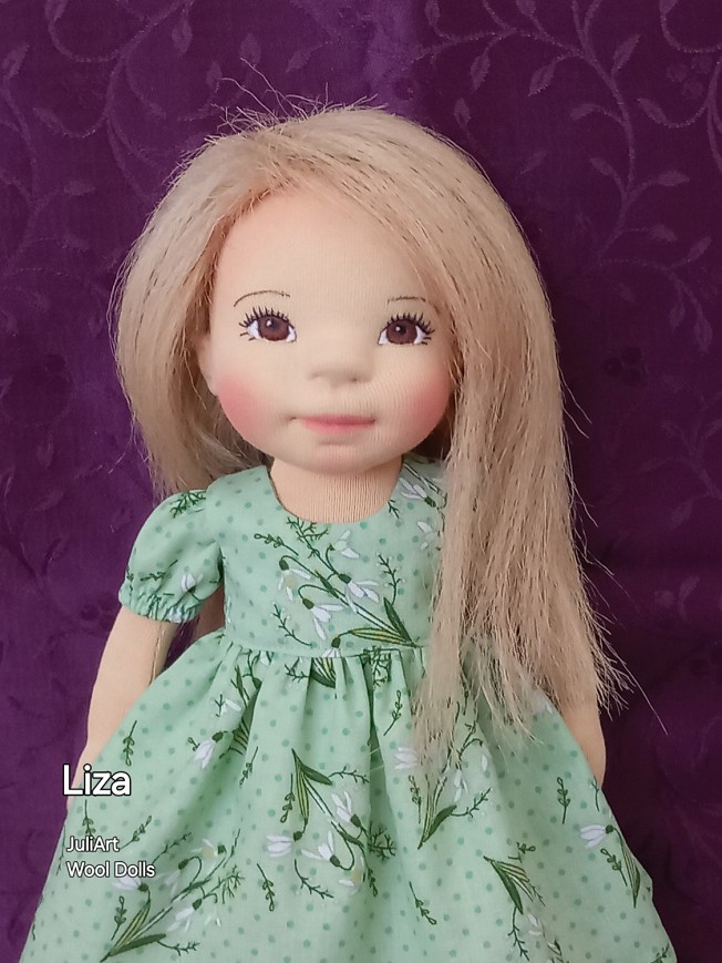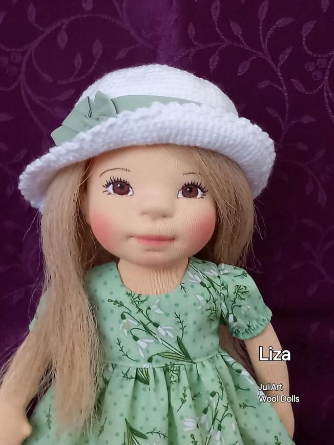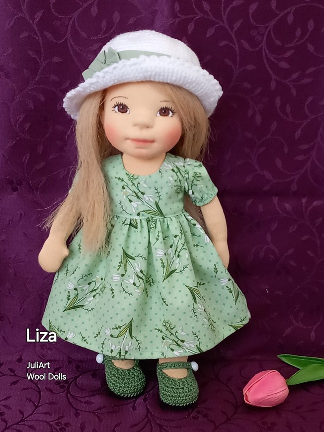 Liza öltöztethető, fésülhető baba. Arcát-testét tűnemezeléssel formáztam, sötétbarna szemeit kézzel hímeztem. Haja gyapjútincsekből készült, frizurázható, ritka fogú fésűvel fésülhető. Pamutvászon hóvirág mintás ruhácskával, horgolt kalappal, horgolt pántos cipőcskével érkezik. Plusz ruhát is kérhetsz hozzá a rendeléssel egyidőben vagy a későbbiekben bármikor.