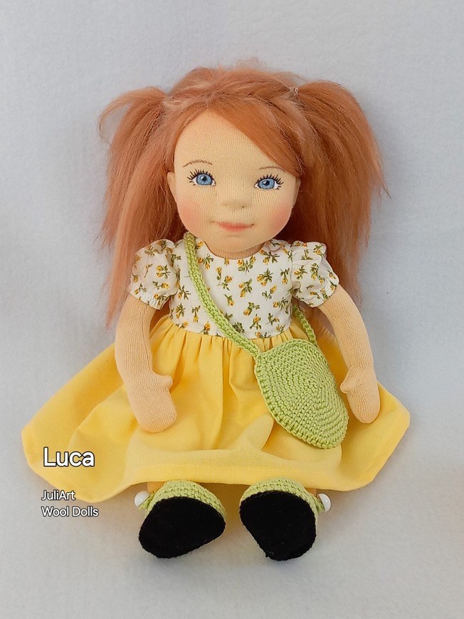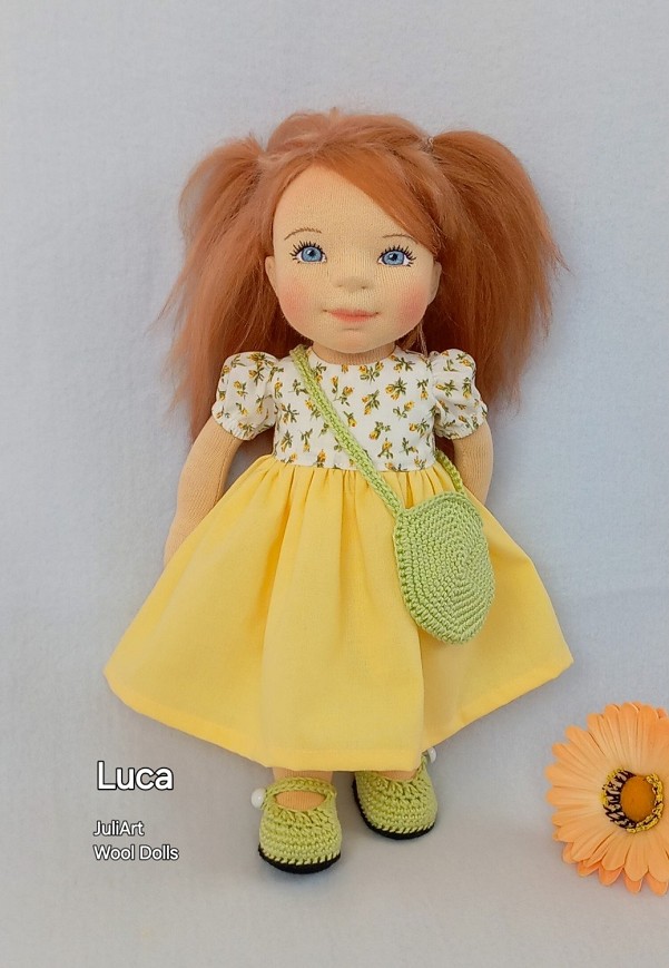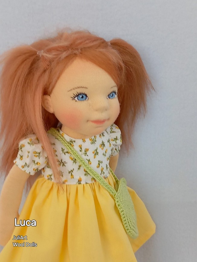 Luca öltöztethető, fésülhető baba. Arcát-testét tűnemezeléssel formáztam, égszínkék szemeit kézzel hímeztem. Vörös haja gyapjútincsekből készült, frizurázható, ritka fogú fésűvel fésülhető. Pamutvászon ruhácskával, horgolt pántos cipőcskével, horgolt kistáskával érkezik. Plusz ruhát is kérhetsz hozzá a rendeléssel egyidőben vagy a későbbiekben bármikor.