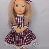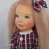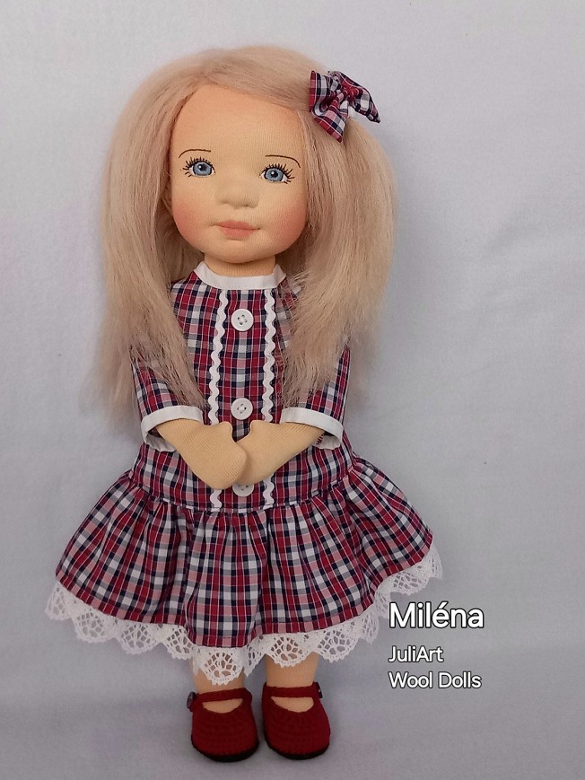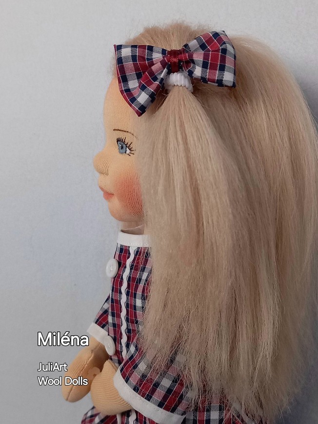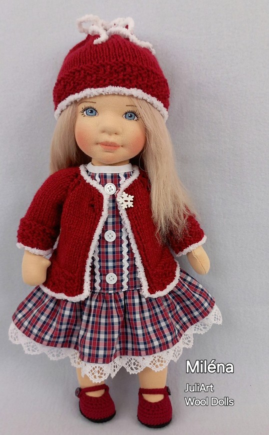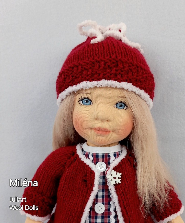 Miléna öltöztethető, fésülhető baba. Arcát-testét tűnemezeléssel formáztam, égszínkék szemeit kézzel hímeztem. Haja gyapjútincsekből készült, frizurázható, ritka fogú fésűvel fésülhető. Pamutvászon ruhácskával, masnis hajgumival, kötött kardigánnal és sapkával, horgolt pántos cipőcskével, érkezik. Plusz ruhát is kérhetsz hozzá a rendeléssel egyidőben vagy a későbbiekben bármikor.