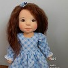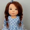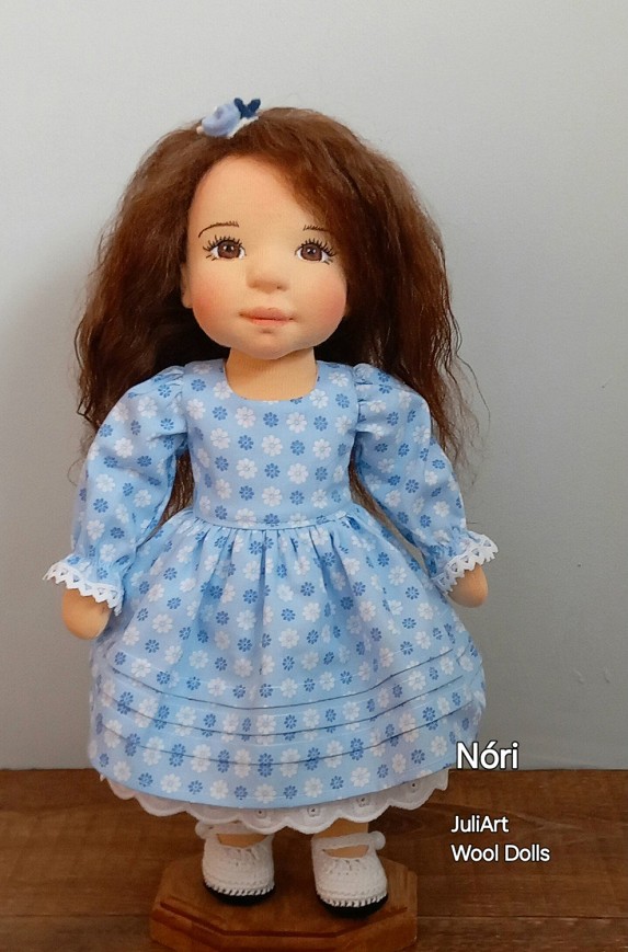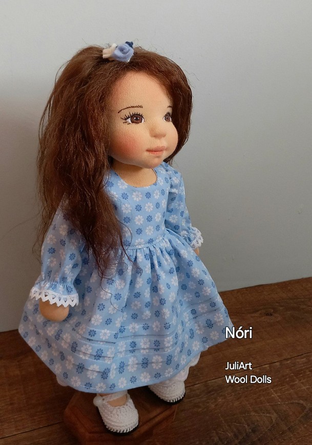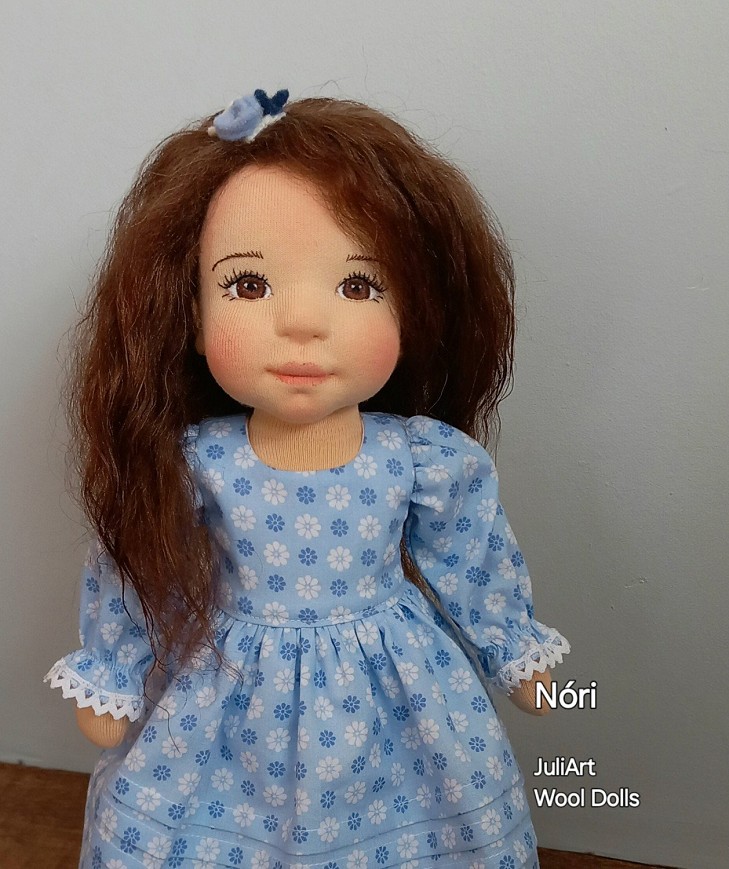 Nóri öltöztethető, fésülhető baba. Arcát-testét tűnemezeléssel formáztam, sötétbarna szemeit kézzel hímeztem. Haja gyapjútincsekből készült, frizurázható, ritka fogú fésűvel fésülhető. Pamutvászon ruhácskával, horgolt pántos cipőcskével, gyapjúfilcből készült hajpánttal érkezik. Plusz ruhát is kérhetsz hozzá a rendeléssel egyidőben vagy a későbbiekben bármikor.