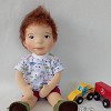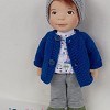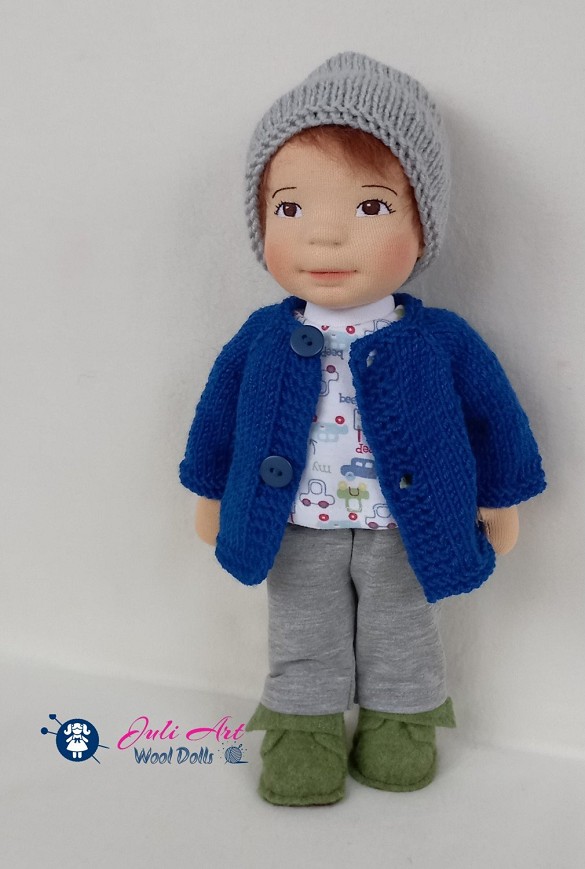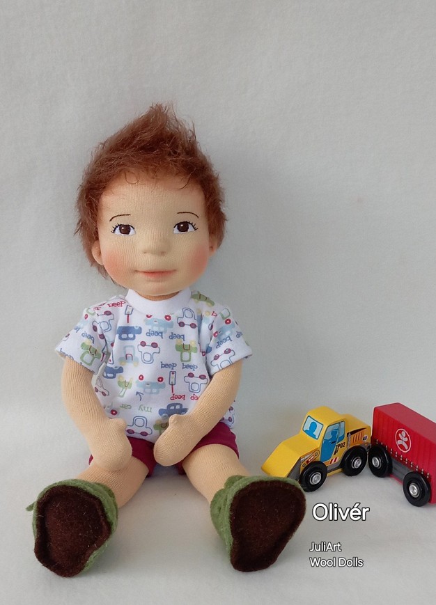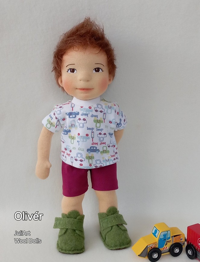 Olivér öltöztethető, fésülhető baba. Arcát-testét tűnemezeléssel formáztam, sötétbarna szemeit kézzel hímeztem. Haja mohair fonalból készült. Kis pamut pólóval, rövidnadrággal, hosszú nadrággal, kötött kardigánnal és sapkával, tépőzáras gyapjúfilc cipővel érkezik. Plusz ruhát is kérhetsz hozzá a rendeléssel egyidőben vagy a későbbiekben bármikor.