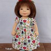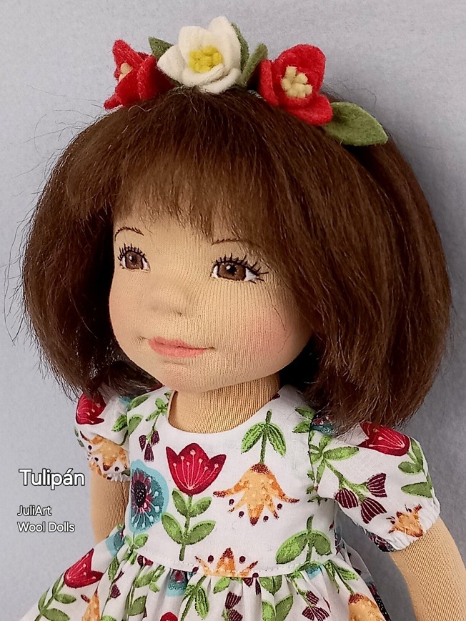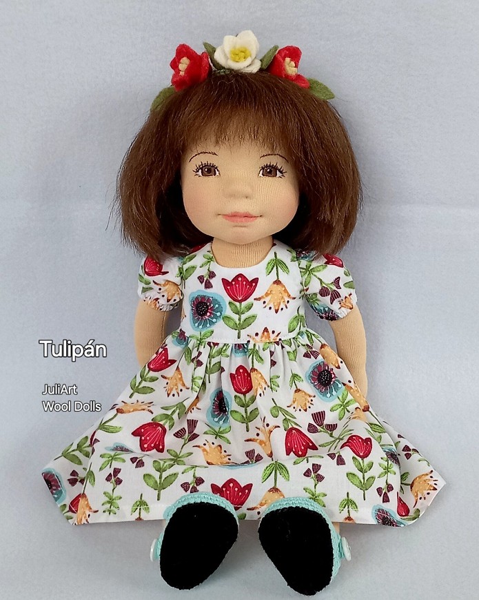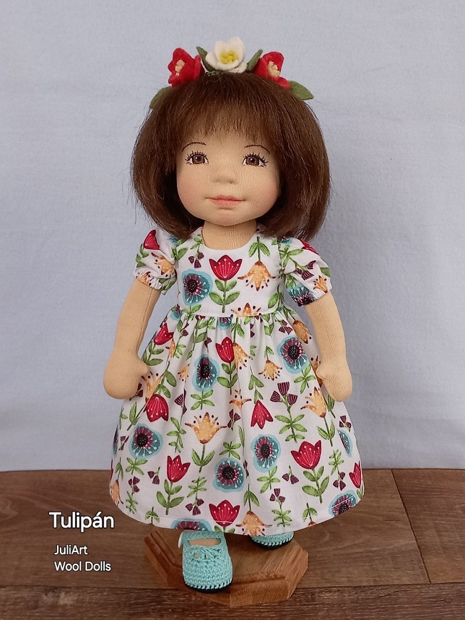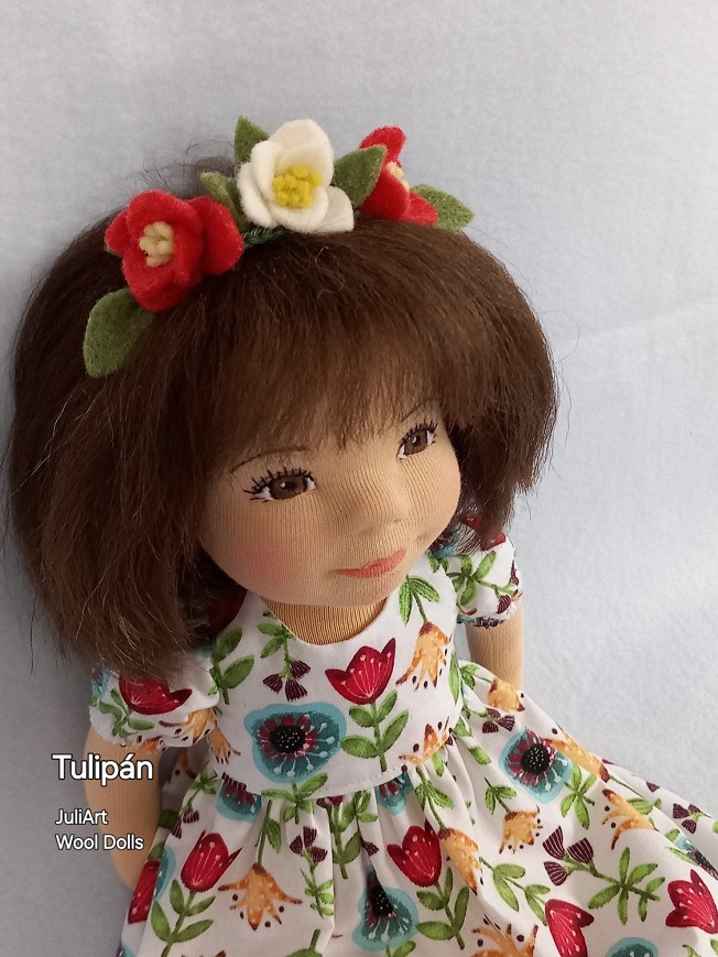 Tulipán öltöztethető, fésülhető baba. Arcát-testét tűnemezeléssel formáztam, sötétbarna szemeit kézzel hímeztem. Haja gyapjútincsekből készült, frizurázható, ritka fogú fésűvel fésülhető. Pamutvászon ruhácskával, horgolt pántos cipőcskével, gyapjúfilcből készült hajpánttal érkezik. Plusz ruhát is kérhetsz hozzá a rendeléssel egyidőben vagy a későbbiekben bármikor.