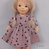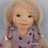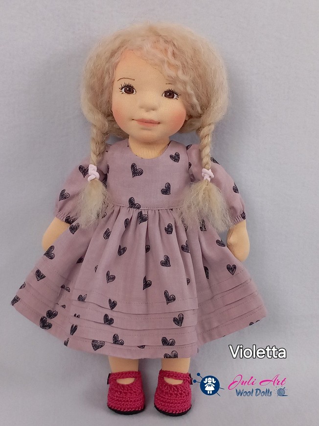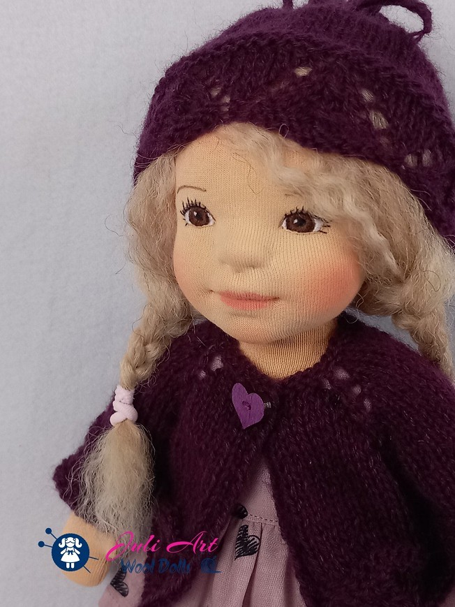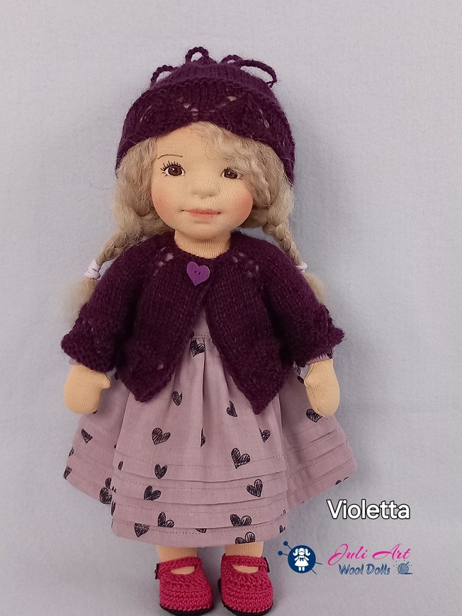 Violetta öltöztethető, fésülhető baba. Arcát-testét tűnemezeléssel formáztam, sötétbarna szemeit kézzel hímeztem. Haja gyapjútincsekből készült, frizurázható, ritka fogú fésűvel fésülhető. Pamutvászon ruhácskával, horgolt pántos cipőcskével, kötött kardigán-sapka szettel érkezik. Plusz ruhát is kérhetsz hozzá a rendeléssel egyidőben vagy a későbbiekben bármikor.